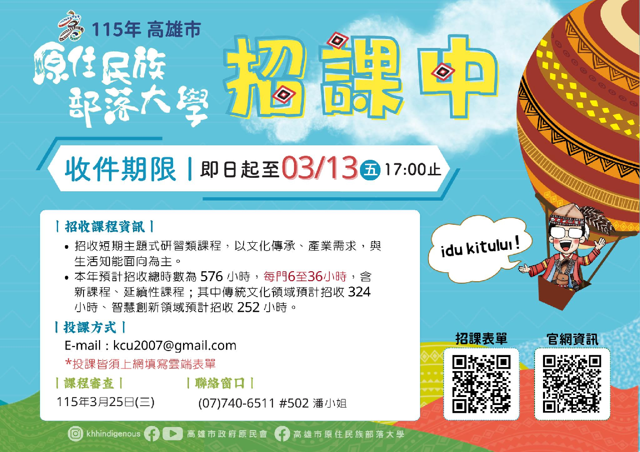 一、旨揭課程招收簡章等附件請至官網公告下載,網址:https://reurl.cc/MMaZrk二、投課期程:即日起至3月13日(星期五)下午5時整。三、投課須填寫高雄市原住民族部落大學115年研習類課程招收資訊報名表雲端表單,網址:https://forms.gle/DAbyt2JBmGUCfcnj8。四、聯絡電話:(07)740-6511轉分機502潘江綺。